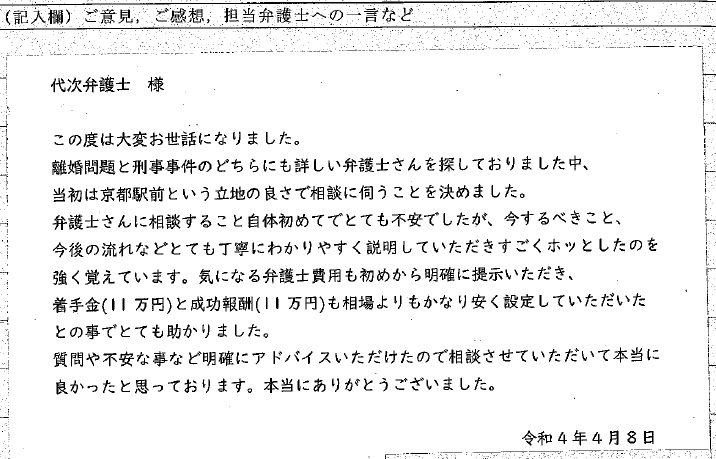 離婚問題と刑事事件のどちらにも詳しい弁護士さんを探しておりました中、当初は京都駅前という立地の良さで相談に伺うことを決めました。