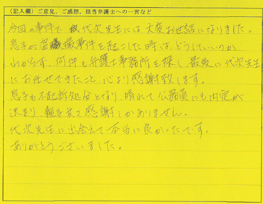 息子も不起訴処分となり、晴れて公務員にも内定が決まり、親子共々感謝しかありません。